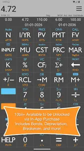 In-App Upgrade: 10bii+ Features (Bonds, Breakeven, Depreciation, Trig, Probabilities) available!If you believe you are having any issues with your calculator, email us and we'll generally reply within the hour and can help resolve the issue. MONEY BACK GUARANTEE!Highlights:- Displays current N, I/YR, PV, PMT and FV values right above buttons - Print or Save PDF Amortization Schedules - Easily enter your Uneven Cashflows in a spreadsheet-like worksheet- Video Tutorials in Help section - Draws Cashflow Diagrams for simple TVM or complex Uneven Cashflows - Saves Recent calculations so you can easily reload them - Easy Mode allows everyone to get the financial answers you need!The 10bii Financial Calculator is a versatile and powerful financial calculator which features more than 105 different functions for financial analysis, business, statistics, and general mathematics. Modeled after the extremely popular 10bII Financial Calculator by Hewlett Packard, the 10bii Financial Calculator combines precise mathematics, intuitive display, and ease-of-use in one compact package. It allows you to easily calculate loan payments, interest rates, amortization, time value of money, investment value, and more using a combination of powerful and intuitive equation-writing functionality and helpful worksheets.By expanding on HP's traditional presentation, the 10bii Financial Calculator allows quick and intuitive building and visualization of TVM (Time Value of Money) calculations and Uneven Cash Flow scenarios and lets you type in whole equations for easy review and one-touch evaluation. With the 10bii Financial Calculator, you can: Calculate Time Value of Money (Length of Term, Present Value, Nominal Interest, Loan Payments, Future Value) and see the cash flow diagram produced for you via the Graph TVM key. Values for N, PV, I, PMT, and FV are displayed right above their keys for easy reference.Easily enter Uneven Cash Flows, including rapid calculation of Net Present Value and Internal Rate of Return. A dedicated interface makes adding, editing, deleting, and reordering uneven cash flows a breeze. Switch between Nominal and Effective interest rates with the simple touch of a button. Enter and analyze statistical data points. Includes standard calculations such as standard deviation, mean, and linear regression forecasting. Never has using a financial calculator been so easy or intuitive. The 10bii Financial Calculator is truly powerful enough for the professional but accessible enough for everyone. It is an ideal tool for teaching the power of compounding interest, analyzing potential deals or business ventures, or just doing math problems, and sharing the results of your work with others.The 10bii app is the updated version of the 10b app. Also known as the 10b2.